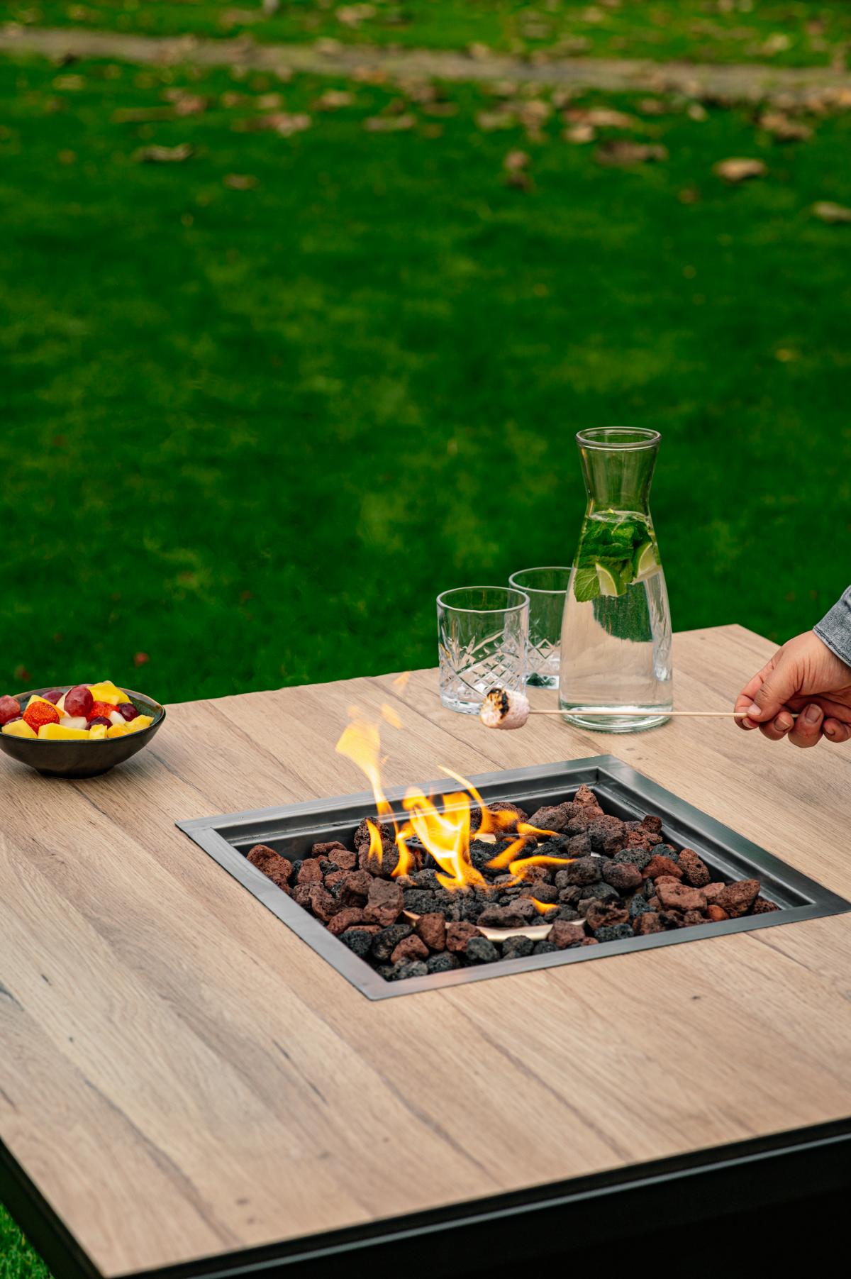 Výkon hořáku až 8,8 kW dokáže pohodlně vyhřát okolní prostor a umožňuje tak prodloužit venkovní sezónu. Přes hořák ohniště lze umístit kovový kryt a z ohniště se rázem stane zahradní stůl na odkládání nápojů a jídla.