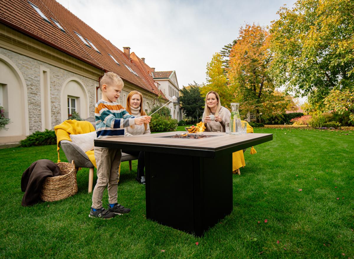 Centrem ohniště je nerezový hořák doplněný lávovými kameny a keramickými polínky, díky nimž oheň vypadá mimořádně autenticky.