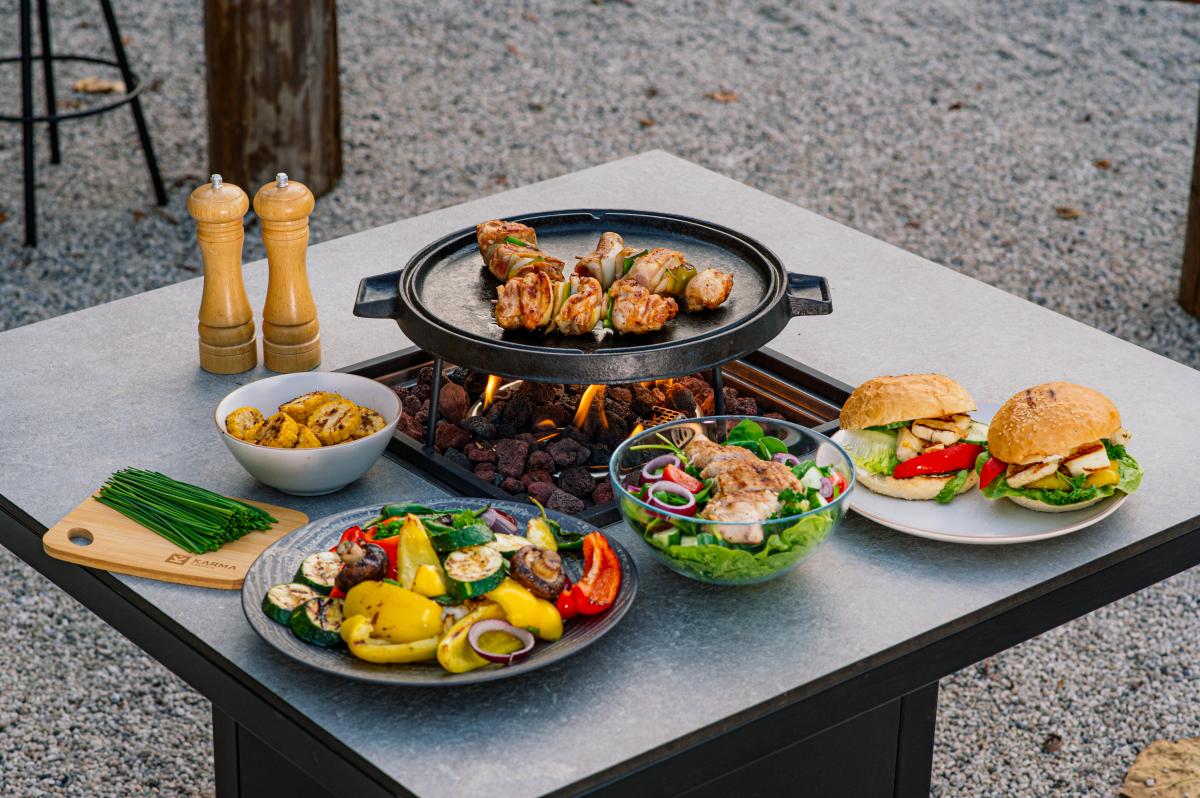 Ohniště lze doplnit oboustrannou litinovou pánví, která se skvěle hodí na moderní grilování ve stylu plancha. Díky ní si i na plynovém ohništi můžete připravit masové pochoutky, mořské plody, různé druhy zeleniny či oblíbené indické placky.