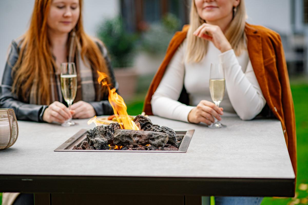 Výkon hořáku až 8,8 kW dokáže pohodlně vyhřát okolní prostor a umožňuje tak prodloužit venkovní sezónu. Přes hořák ohniště lze umístit kovový kryt a z ohniště se rázem stane barový stůl na odkládání nápojů a jídla.